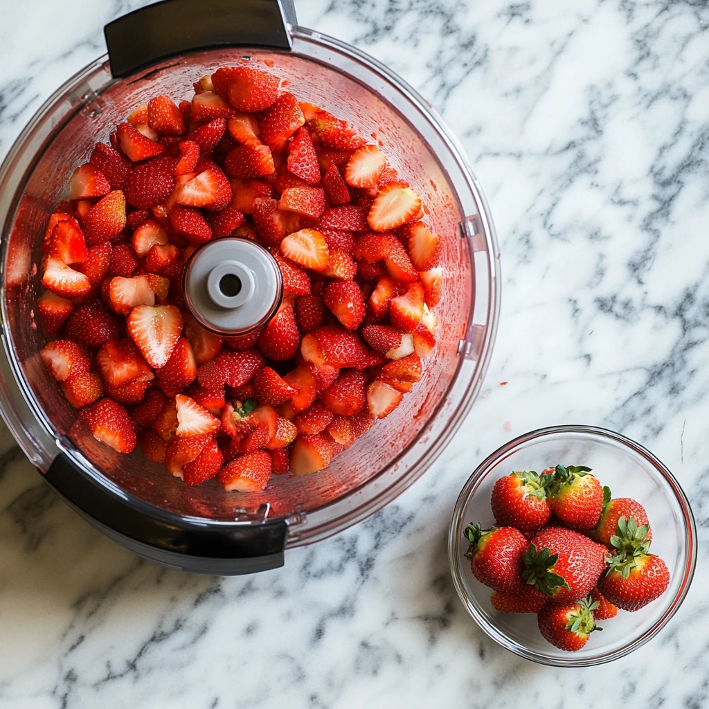 Next, grab your blender or food processor and toss in the hulled strawberries. Blend until smooth—you want a nice, even puree with no big chunks. Once it’s blended, set it aside while you whip up the creamy base.