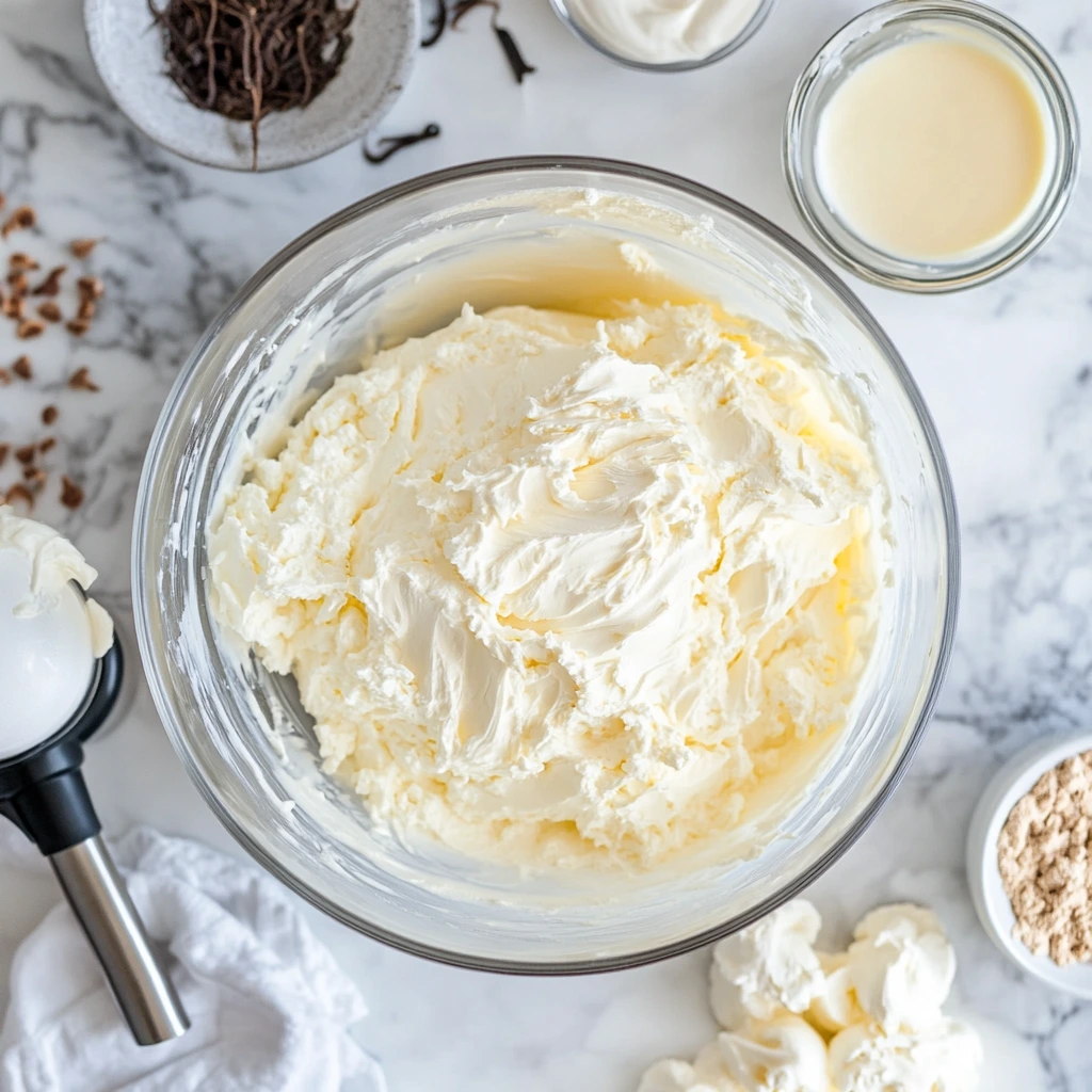 Now it’s time to start building that dreamy filling. In a large mixing bowl, beat the softened cream cheese until smooth and fluffy. It helps to let it come to room temp first—no one likes lumpy cream cheese in their pie!