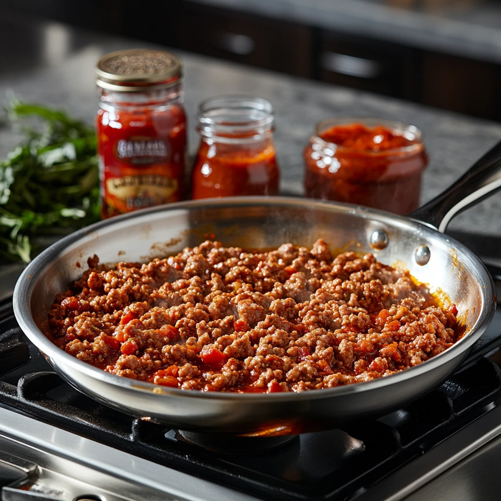 While your tots are crisping up, it’s time to get the meat sauce going. In a skillet, cook 1 pound of ground Italian sausage or beef over medium heat. Break it up as it cooks to ensure that it’s evenly browned and crumbled. Once it’s fully cooked, drain any excess grease. Then, stir in the pizza sauce (or marinara if you prefer), Italian seasoning, and garlic powder. Mix everything well to combine. The seasoning will add an irresistible flavor to the sauce, and the garlic powder gives it that extra boost of flavor that pairs so well with the pizza theme.