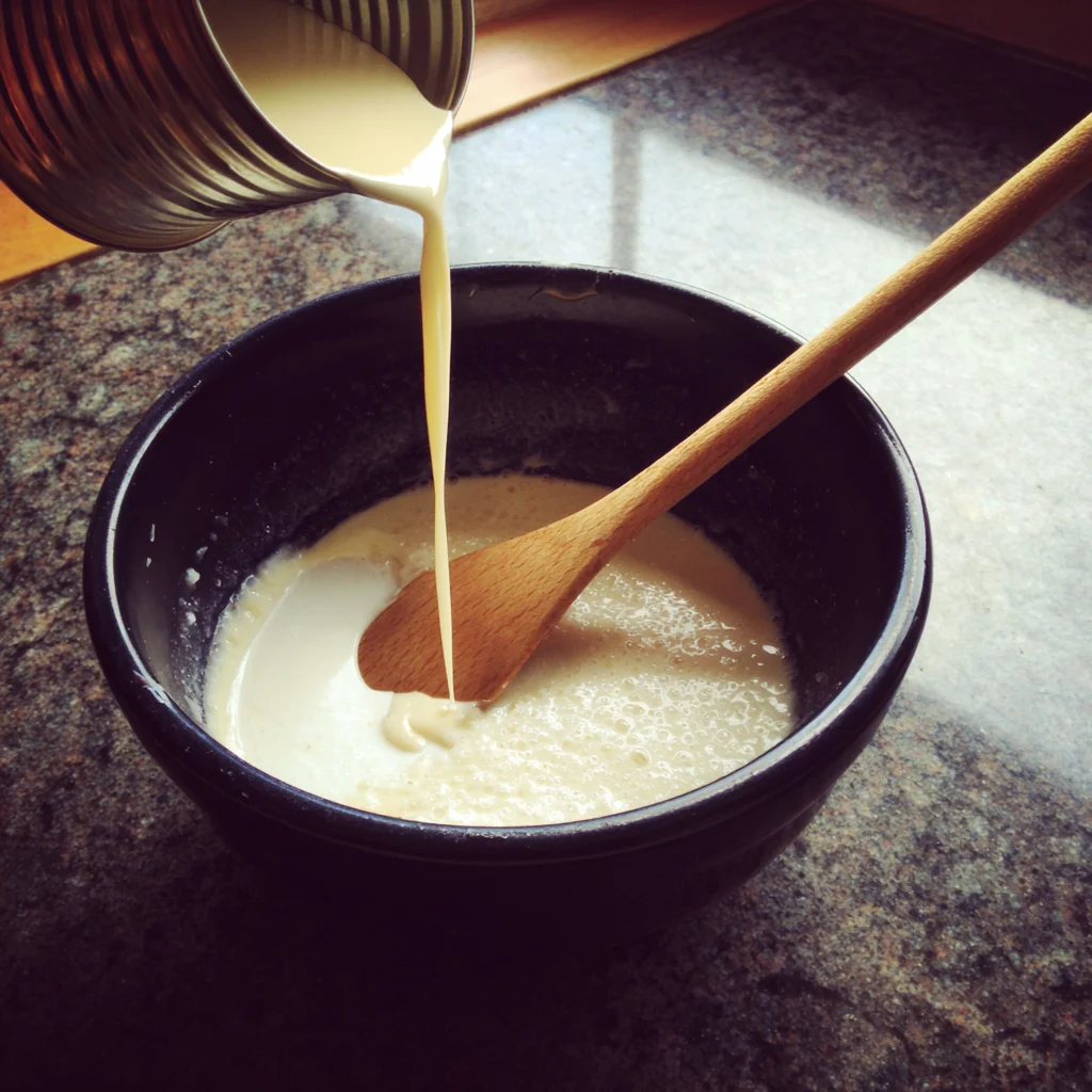 Now, pour in 1 cup of sweetened condensed milk. Stir everything until it’s well combined. The mixture will be thick and sticky—kind of like cookie dough but with way more crunch.