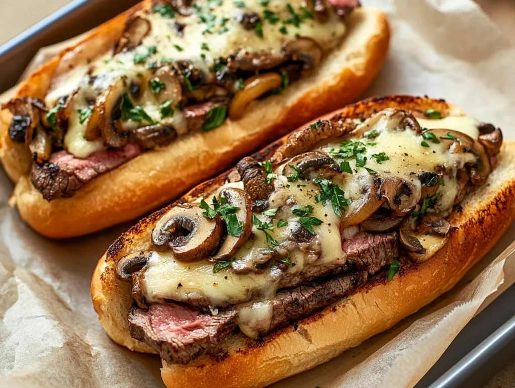 5️⃣ Prepare the sandwiches: Preheat your broiler. Place hoagie rolls on a baking sheet, open-side up. Fill each roll generously with the steak and mushroom mixture. Top with sliced provolone cheese.